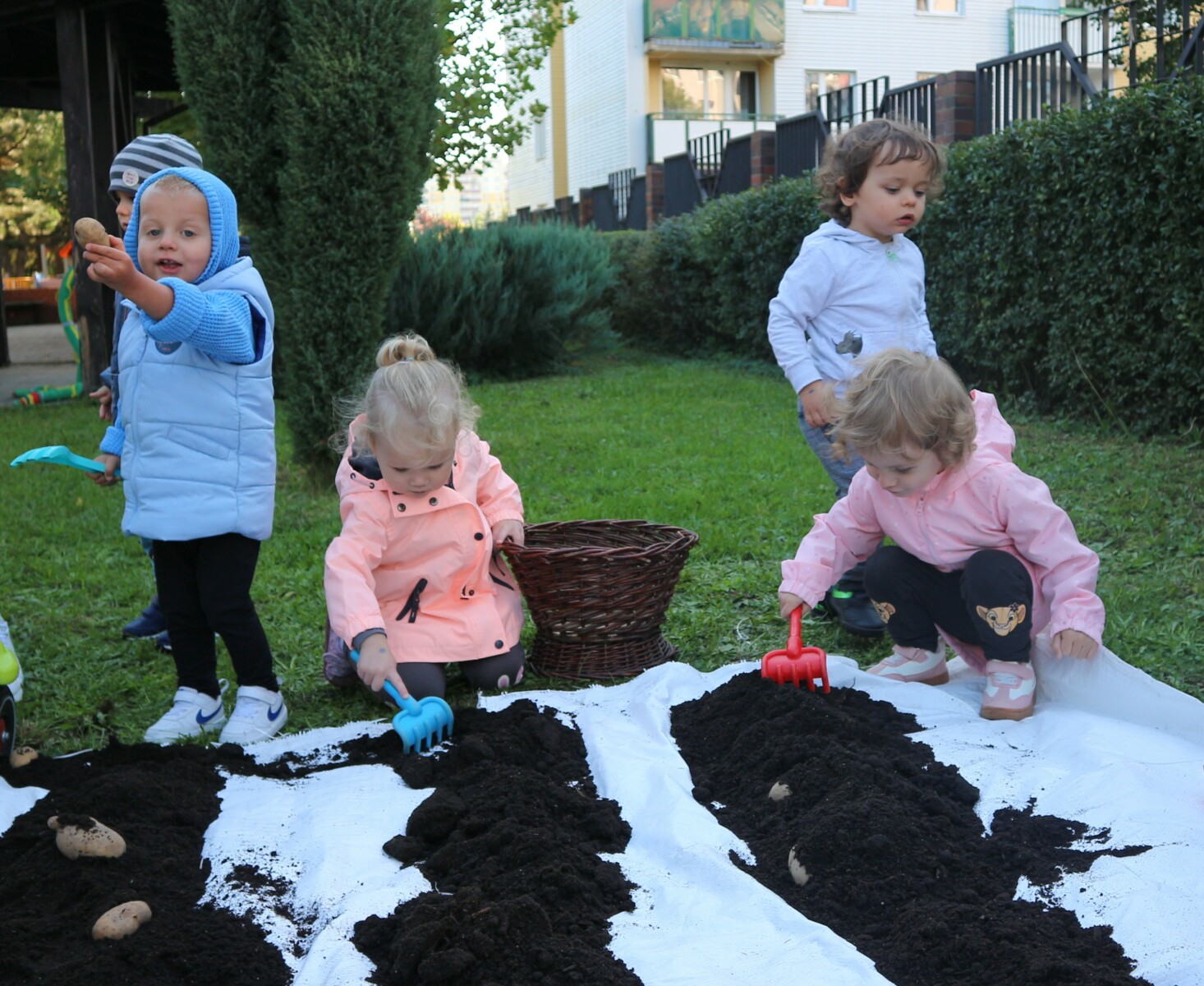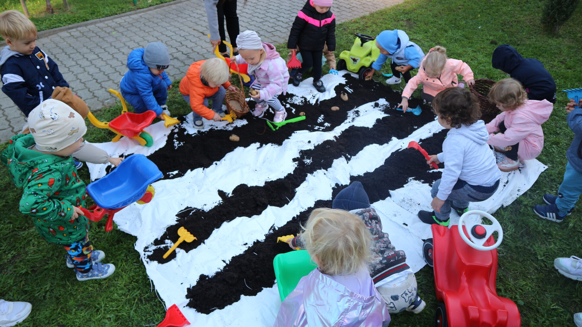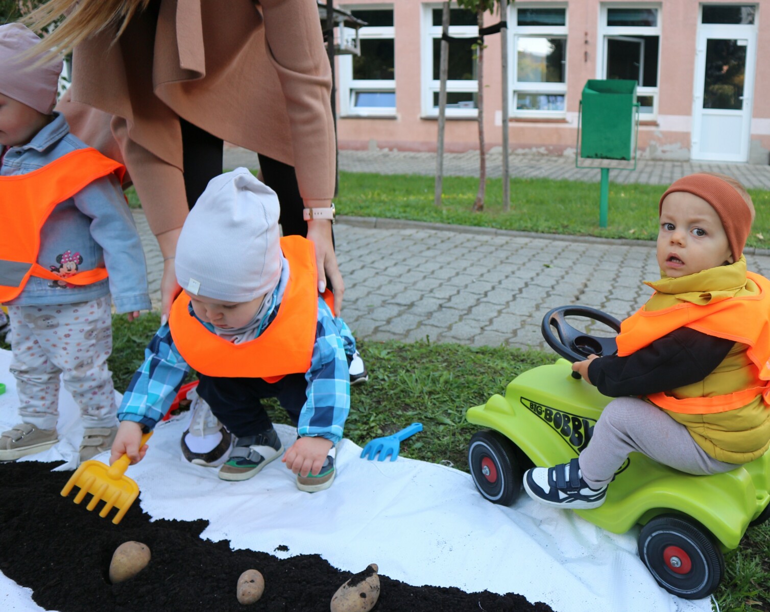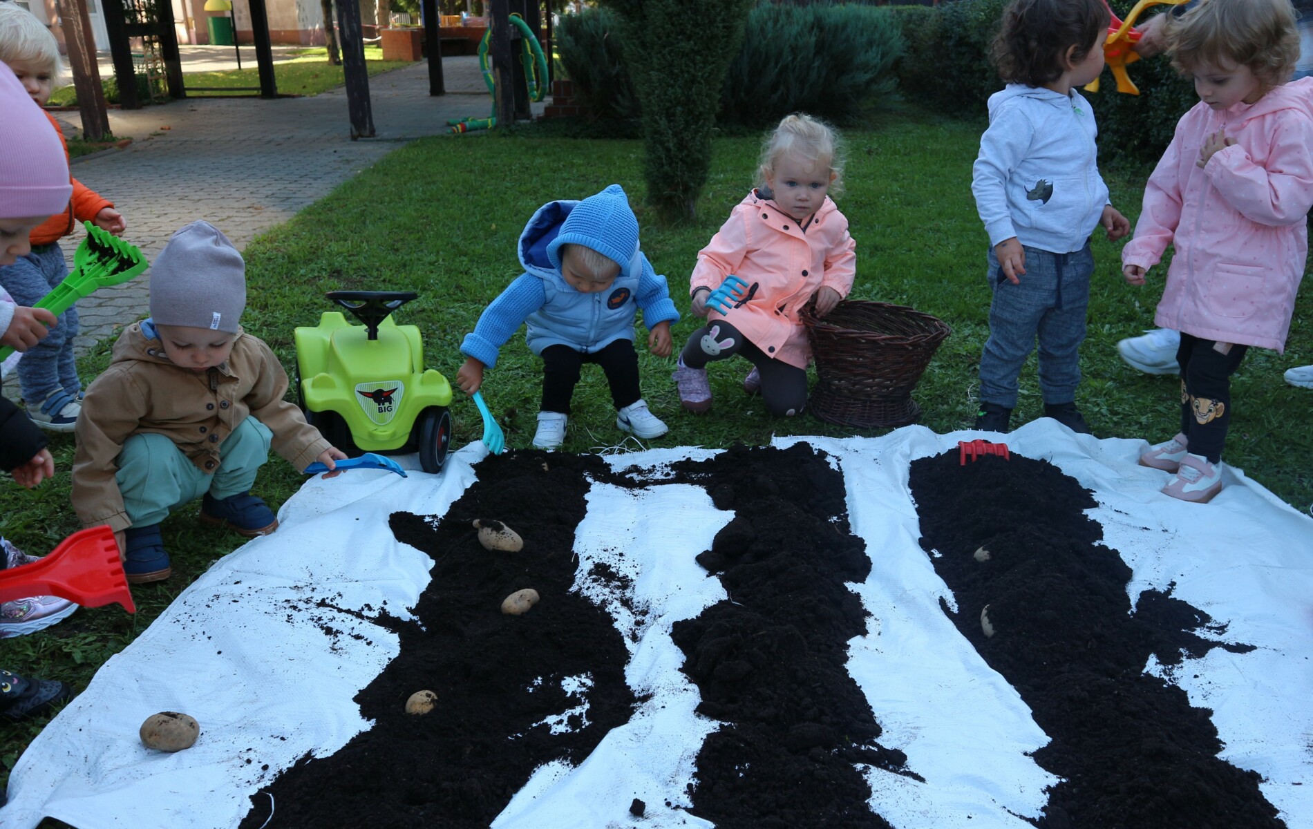 Dziś w naszym żłobku odbyły się wyjątkowe wykopki ziemniaczane .Dzieci z ogromnym zaangażowaniem odkrywały ziemniaki ukryte w ziemi ,a przy tym uczyły się skąd bierze się jedzenie , które trafia na nasze stoły.  Było mnóstwo radości, śmiechu i ciekawych odkryć .Mali odkrywcy bawili się doskonale ,rozwijając swoją ciekawość świata i sprawność manualną .