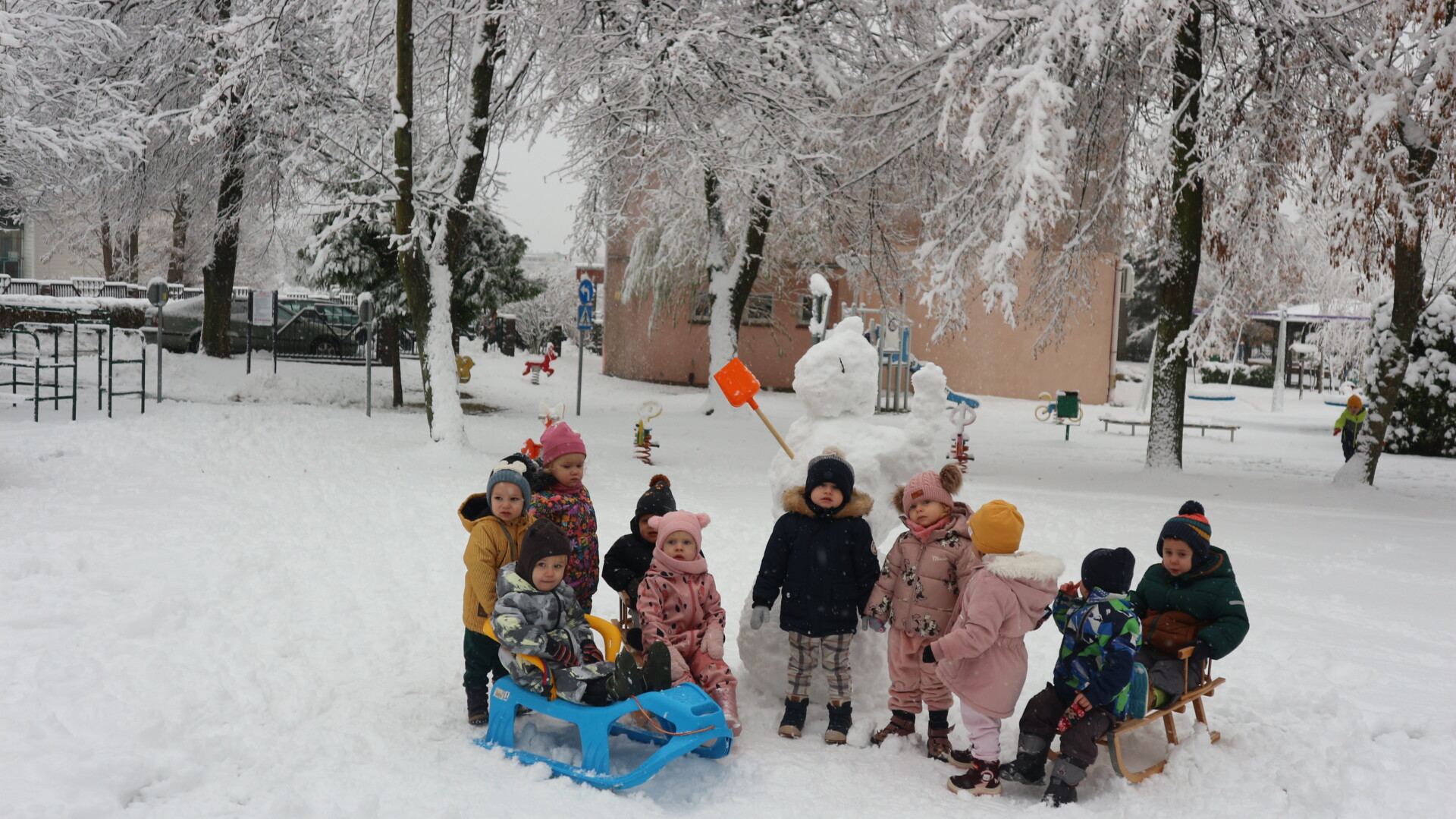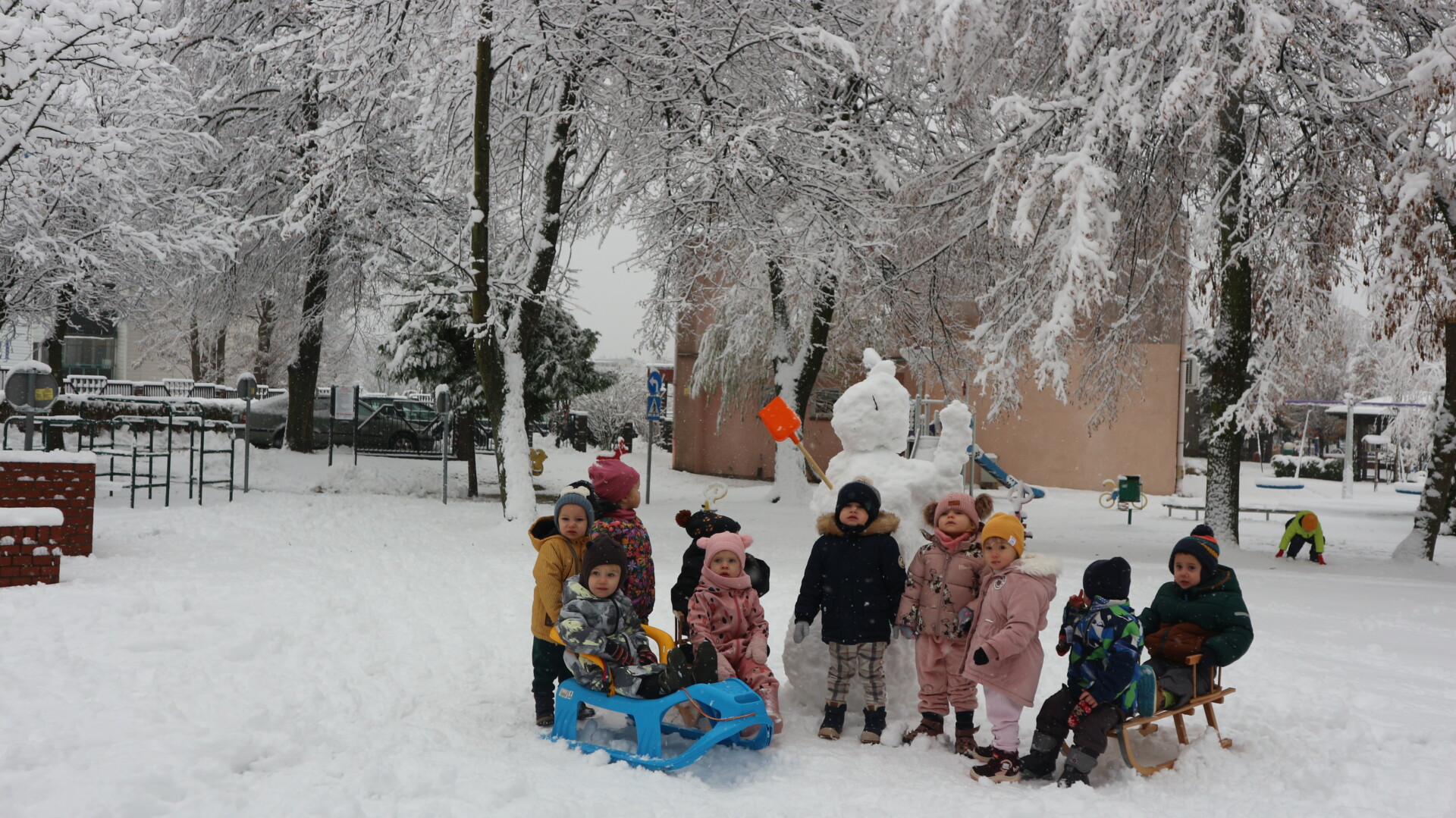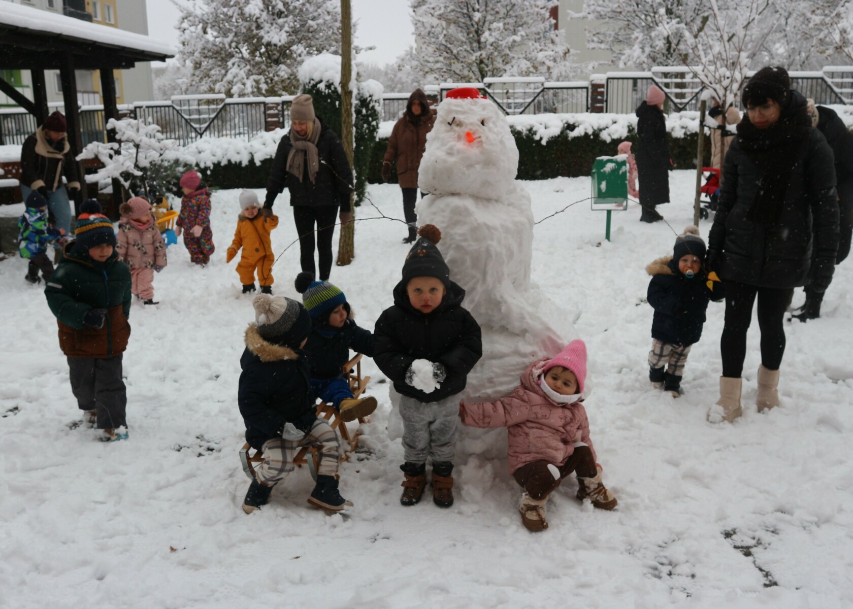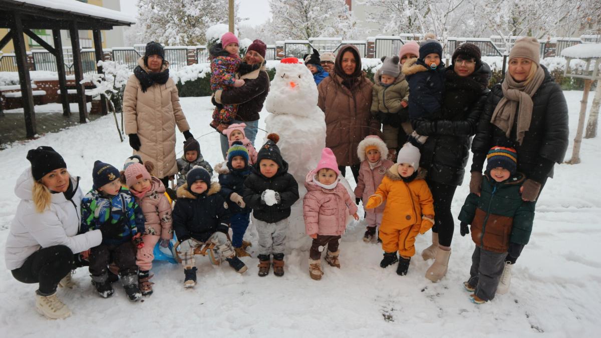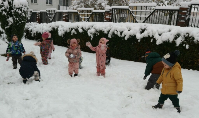 Dziś spadł pierwszy śnieg w tym roku , sprawił dzieciom ogromną radość. Maluchy z entuzjazmem wyszły na dwór , gdzie oddały się zimowym zabawom. Lepiły bałwana ,robiły aniołki ,rzucały się śnieżkami